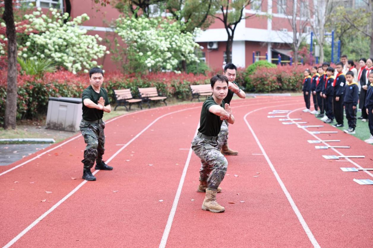 马明智、林海明、陈烈钧、梁雪飞四位学生代表优秀退役士兵演示擒拿拳,刚劲有力、娴熟到位的拳法赢得了台下少先队员们的阵阵掌声,随后进行了寓教于乐的拳术教学活动。