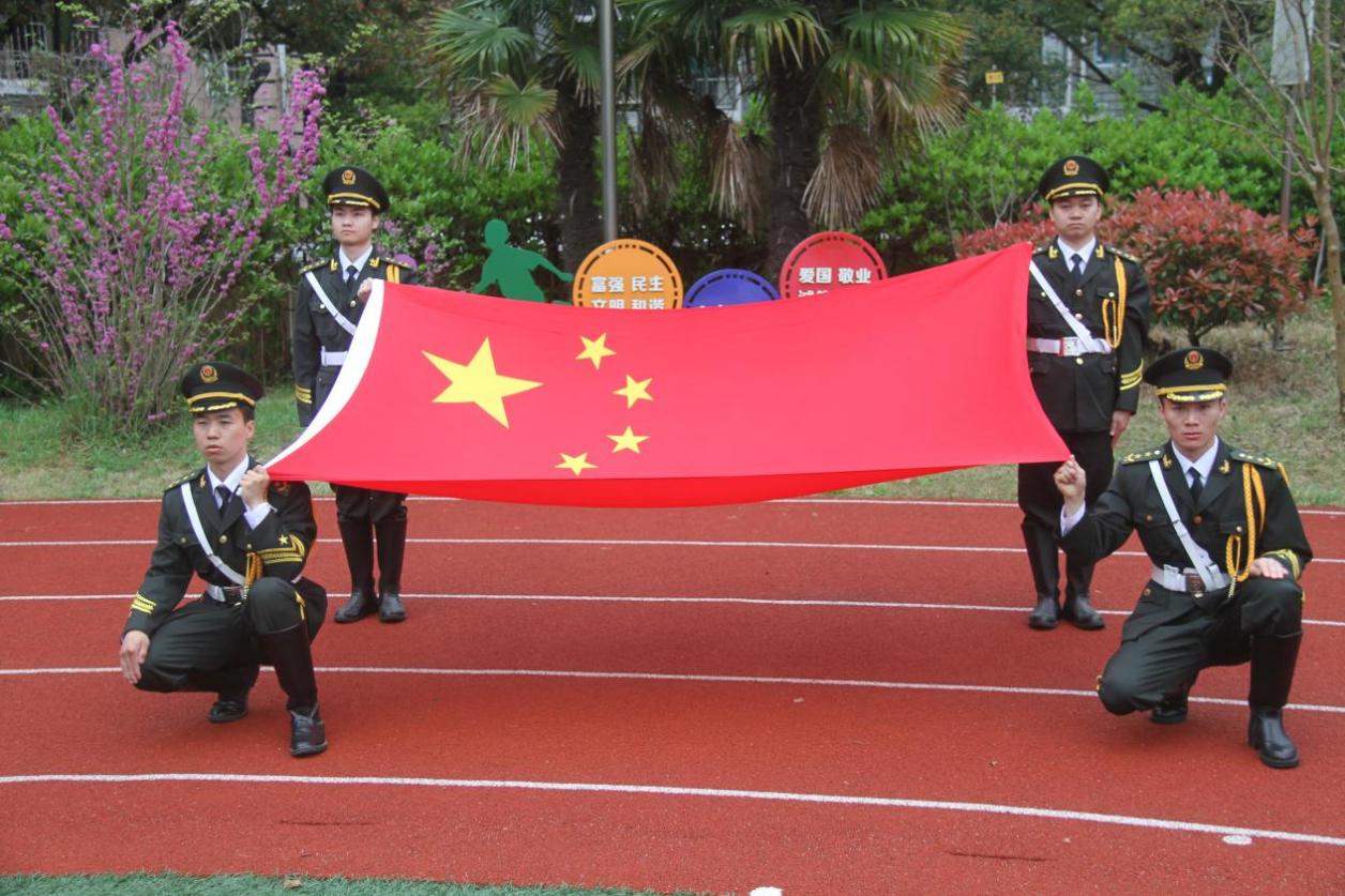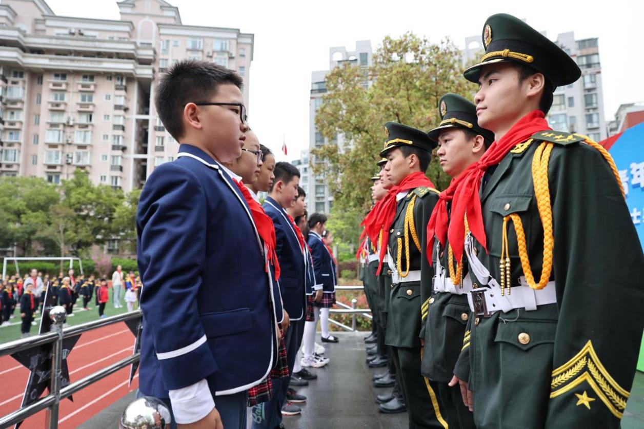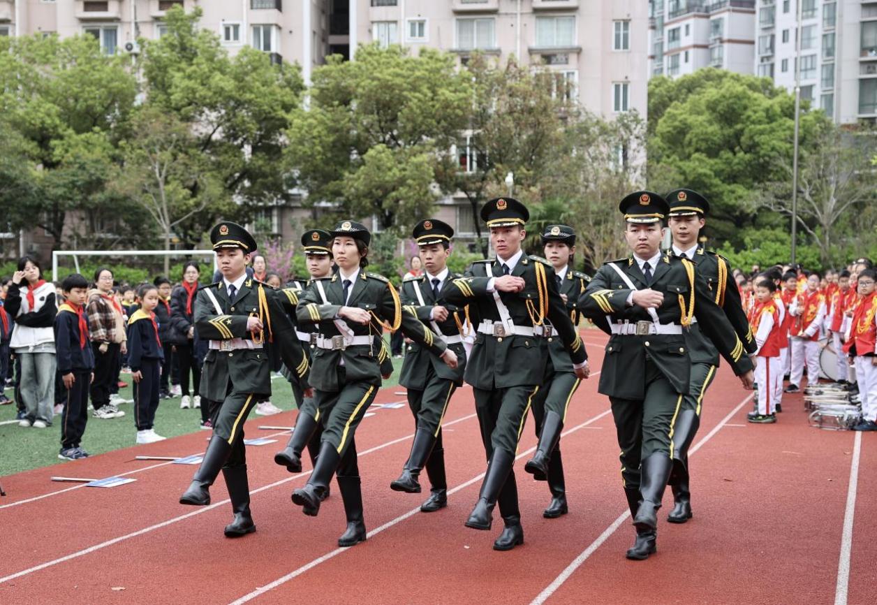 校国旗护卫队9位队员向少先队员进行队列展示,动作整齐划一,反应准确迅速,展现出优秀的军事素养和过硬的军事本领。