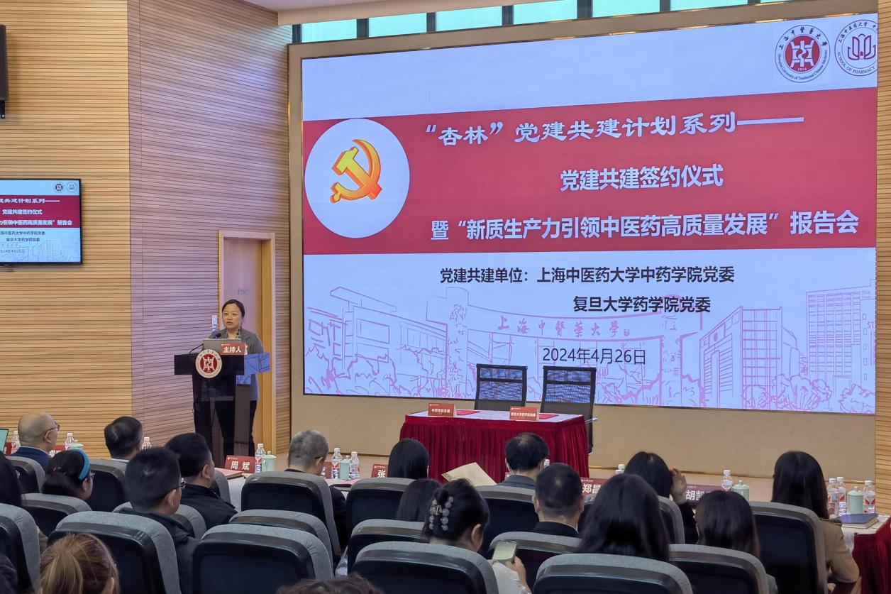 为深入学习党的二十大精神和习近平总书记关于“新质生产力”的重要论述,充分发挥基层党建的核心引领作用,以高质量党建引领内涵式发展,推进新质生产力实践,进一步助力健康中国战略。4月26日,我校中药学院党委与复旦大学药学院在全球合作伙伴中心一楼报告厅举行党建共建签约仪式暨“新质生产力引领中医药高质量发展”报告会。我校党委副书记周斌,复旦大学药学院党委书记王建新、党委副书记史雪茹和王盛,我校中药学院党委书记沈岚、院长张彤、党委副书记陆婧、副院长郑昌武和胡凯莉,以及双方师生党员等共计100余人参加。会议由中药学院党委书记沈岚主持。