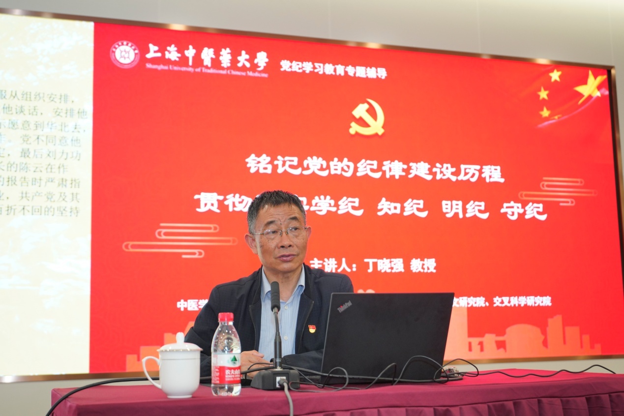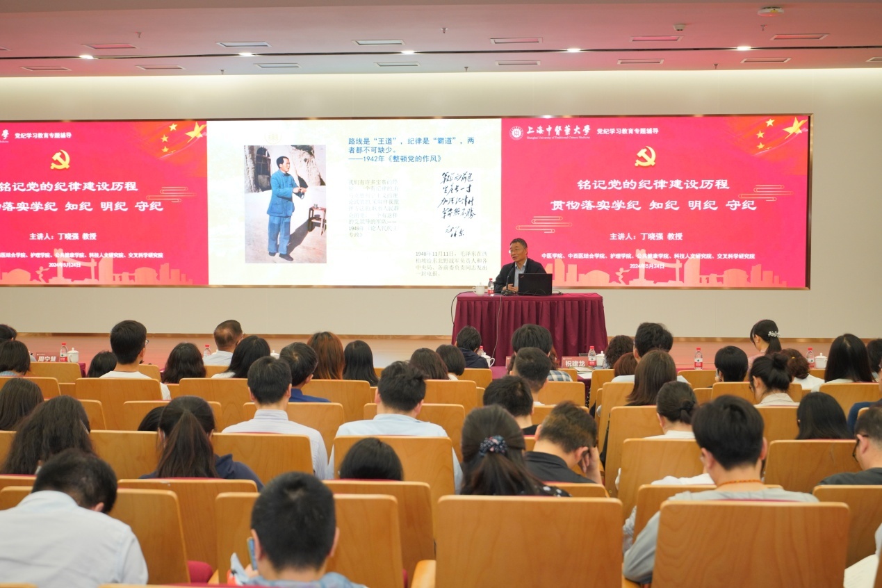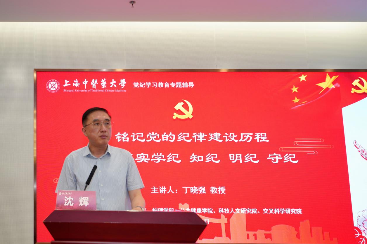 为深入学习贯彻习近平总书记关于党的建设的重要思想和考察上海重要讲话精神,加强党员党性修养,落实中共中央和上海市委关于开展党纪学习教育的部署要求,按照学校党委工作要求,推动党员集中培训及党纪学习教育走深走实,5月24日下午,我校中医学院、中西医结合学院、护理学院、公共健康学院、科技人文研究院和交叉科学研究院6个学院党组织开展师生党员集中培训暨党纪学习教育专题联学,近400名师生党员同上一堂党课。华东师范大学丁晓强教授作专题报告。校党委副书记沈辉及6个学院党政班子成员及师生党员参加了专题联学活动。会议由护理学院党委书记陈正芹主持。