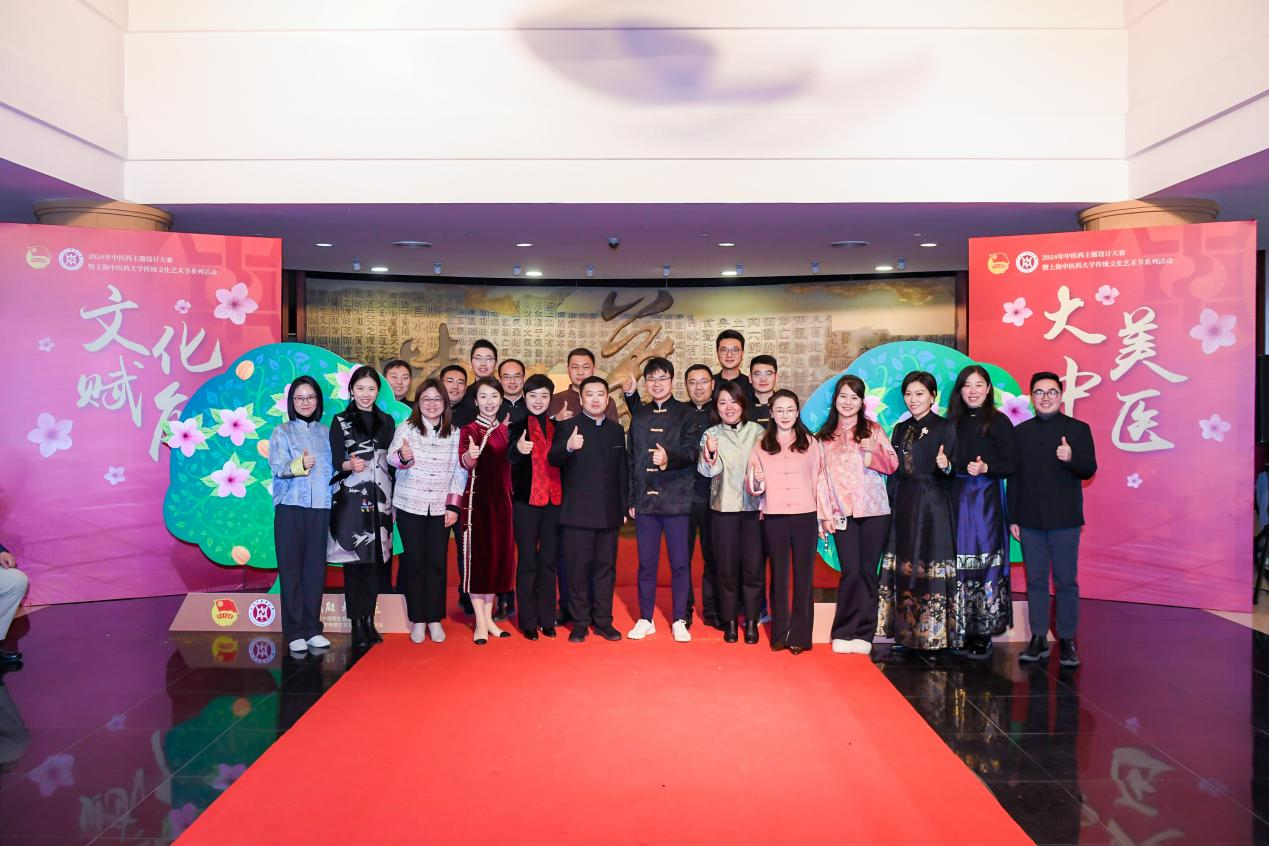 上海中医药博物馆内,上海中医药大学党委书记曹锡康,共青团上海市委员会挂职副书记唐志宇,上海中医药大学党委副书记、副校长朱惠蓉,上海市卫健委中医药传承发展处一级调研员姚玮莉,上海市教委体卫艺科处副处级调研员蒋萍芳,上海市群众艺术馆馆长吴鹏宏,上海太美文化发展有限公司总经理张瑞杰共同上台推杆启动“学以致用”2024年中医药主题设计大赛。