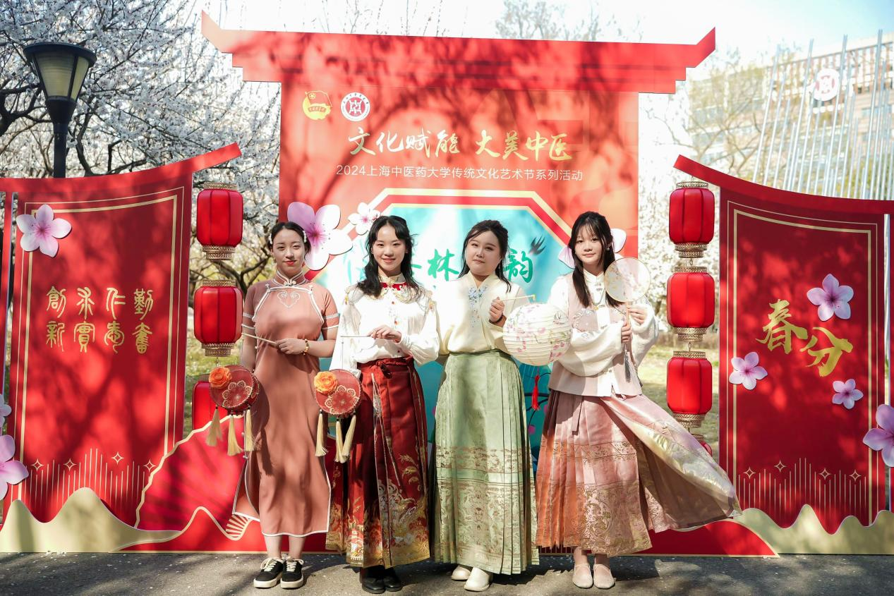 3月20日正值农历春分,来自上海市20余所高校传统文化社团的学生们身着传统服饰共赴杏林古韵游园会。学子们通过汉服走秀、烹茶饮茶、艺术雕刻、中华射艺、扎布印染、香囊制作、闻香识本草等传统文化实践体验,进一步加深对中华优秀传统文化的理解和感悟。“中药香囊和扎染手作”活动让学生们亲身体验了传统技艺,上海中医药大学留学生埃琳娜感叹:“用不同中药配比做成的香囊,功效各不相同,我真正体会到了中医药文化的博大精深。”