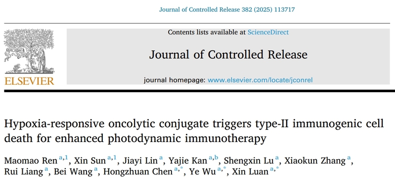 该研究工作近期于国际药学知名期刊Journal of Controlled Release发表题为“Hypoxia-responsive oncolytic conjugate triggers type-II immunogenic cell death for enhanced photodynamic immunotherapy”的研究论文。我校研究生任茅茅和孙鑫为论文第一作者,栾鑫研究员、陈红专教授和吴也副研究员为论文通讯作者。