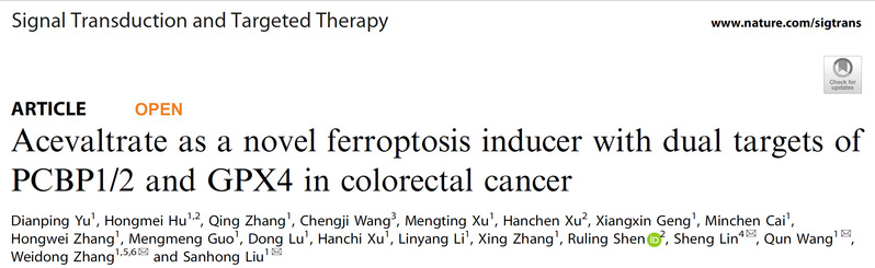 近日,我校交叉科学研究院刘三宏研究员团队联合海军军医大学张卫东团队和北京中医药大学林生团队,在国际知名学术期刊Signal Transduction and Targeted Therapy (STTT)上发表了题为“Acevaltrate as a novel ferroptosis inducer with dual targets of PCBP1/2 and GPX4 in colorectal cancer”的最新研究成果。该研究首次报道了中药小分子乙酰缬草三酯(ACE)通过同时靶向铁伴侣蛋白PCBP1/2和关键抗氧化酶GPX4,高效诱导结直肠癌细胞发生铁死亡的作用机制。