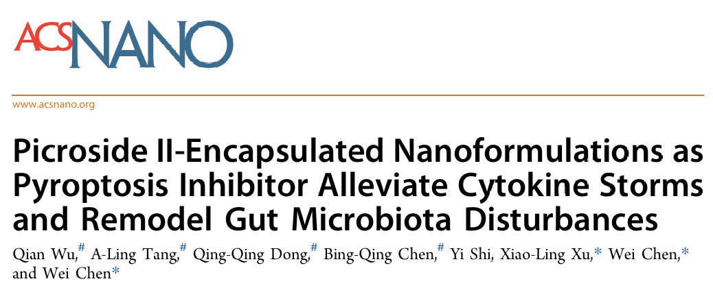9月1日,上海中医药大学附属龙华医院陈伟教授团队于国际权威期刊ACS Nano发表了题为“Picroside II-Encapsulated Nanoformulations as Pyroptosis Inhibitor Alleviate Cytokine Storms and Remodel Gut Microbiota Disturbances”的研究文章,揭示新型中药纳米制剂具备拮抗氧化应激、抑制炎症风暴、调控重塑肠道微生态的作用,可有效干预脓毒症的发生发展。研究涵盖了从分子机制(蛋白水平)到宏观生理(器官功能、菌群调控)的多水平、多维度,为脓毒症的有效治疗提供了潜在的新方案与新策略。