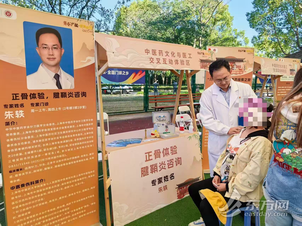 在“中医药文化与医工交叉互动体验区”,正骨体验、腱鞘炎咨询等服务人气持续高涨,吸引了大量市民驻足参与。上海中医药大学附属第七人民医院中医骨伤科朱轶主任现场坐诊,不仅为市民提供中医骨伤科特色诊疗体验,还针对性的给出健康建议。