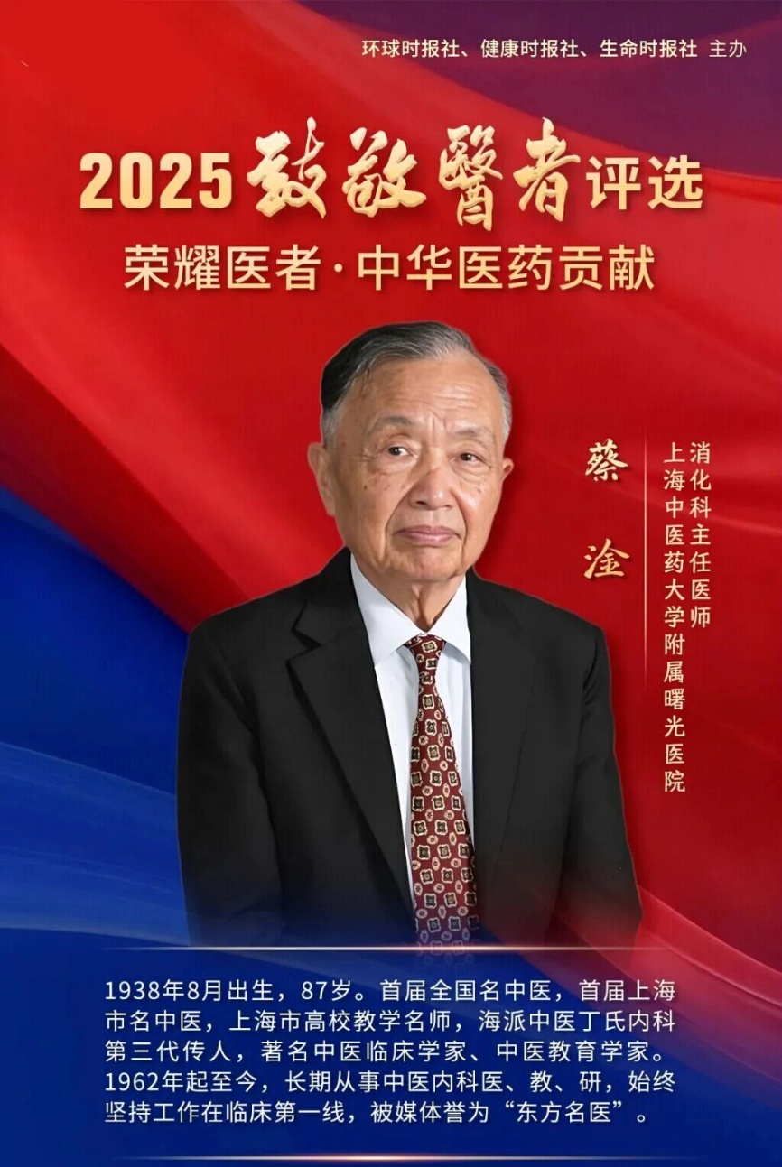 蔡淦生于1938年,今年87岁,全国名中医,上海中医药大学附属曙光医院终身教授,博士生导师,全国著名中医脾胃病临床专家和中医教育家,全国老中医药专家学术经验继承工作指导老师,国家中医药管理局脾胃病重点专科学术带头人。从事中医科教研工作六十余载,擅长脾胃病及疑难杂症的诊治,以“治病求本,以人为本”为行医准则,深受患者爱戴。