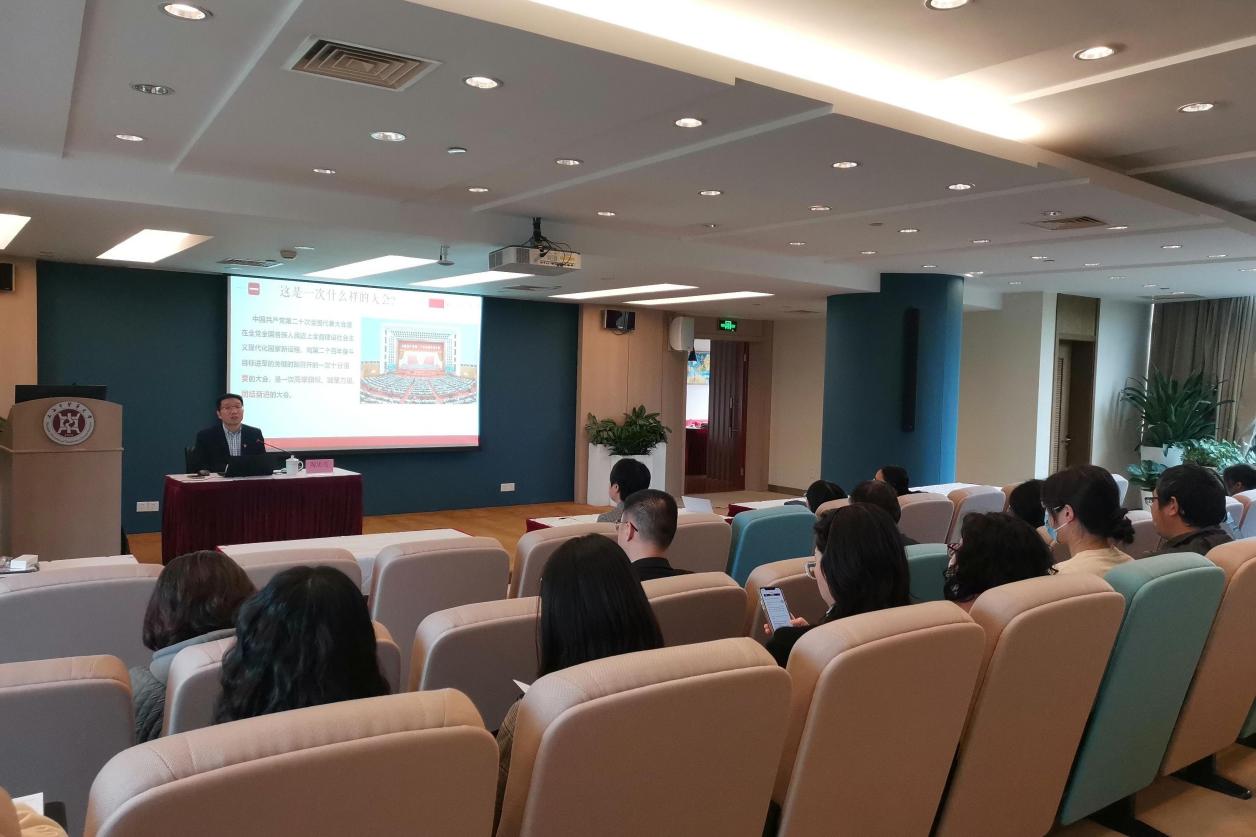为了深入学习贯彻党的二十大精神,引领全院教职工充分认识党的二十大的重大意义,准确把握党的二十大精神的核心要义,11月14日,国际教育学院举办教职工专题政治理论学习,邀请“杏马”理论宣讲团成员、马克思主义学院党总支书记陶思亮教授作专题辅导报告。
