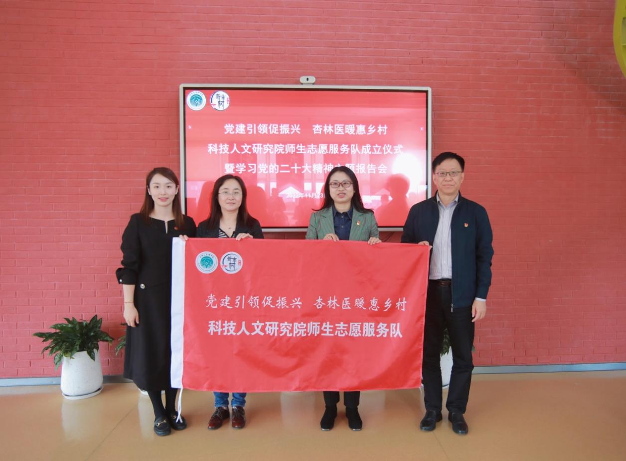为学习贯彻党的二十大精神,进一步打造党建特色,发挥中医药优势,服务乡村振兴,11月23日下午,“党建引领促振兴 杏林医暖惠乡村”科技人文研究院师生志愿服务队成立仪式暨学习党的二十大精神主题报告会在国际交流合作中心多功能厅举行。科技人文研究院党总支书记吴志新,副院长、副书记张亭立,校团委书记万婕,张江镇新丰村居民区党总支第一书记季群、党总支书记周建云,上海市委党校谷宇教授,科技人文研究院第一党支部书记徐丽莉、第五党支部书记王欢等师生代表出席。科技人文研究院第二党支部书记任宏丽主持会议。