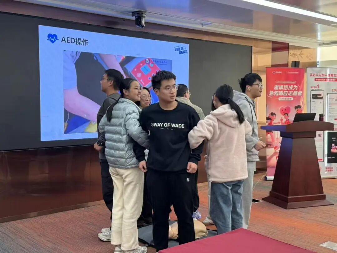 在理论学习环节,急救员课程导师吴老师通过生动的快问快答形式,带领学员们了解心脏骤停的发生机制和骤停后的生理变化等,展示“黄金4分钟”的紧迫性,并详细拆解“院外心脏骤停成人生命链”——从立即识别启动急救、高质量心肺复苏(CPR)、尽早除颤(AED),到高级生命支持及康复治疗的全链条救援逻辑。