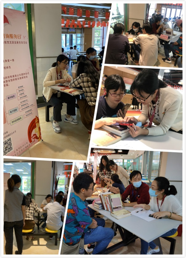 活动中,参与师生咨询的内容主要为图书馆的基本服务、电子资源及学科分析等。为了让更多师生知晓此次活动,享受此项服务,图书情报党支部将活动地点设在人流量较大的学生食堂一楼入口处,并选在中午师生用餐高峰时段开展。