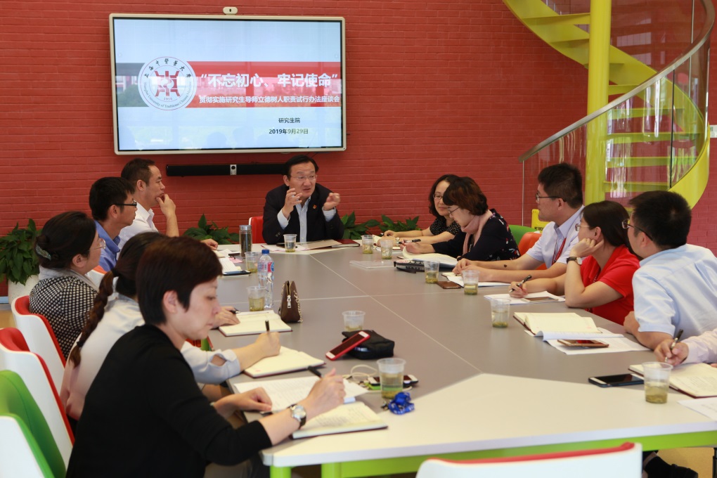 9月29日下午,贯彻实施研究生导师立德树人职责试行办法座谈会在国际交流中心三楼多功能厅举行,校长徐建光,人事处、研究生工作部、学校部分二级学院、研究所的分管领导参加座谈研讨,会议由研究生院党支部书记陈跃来主持。