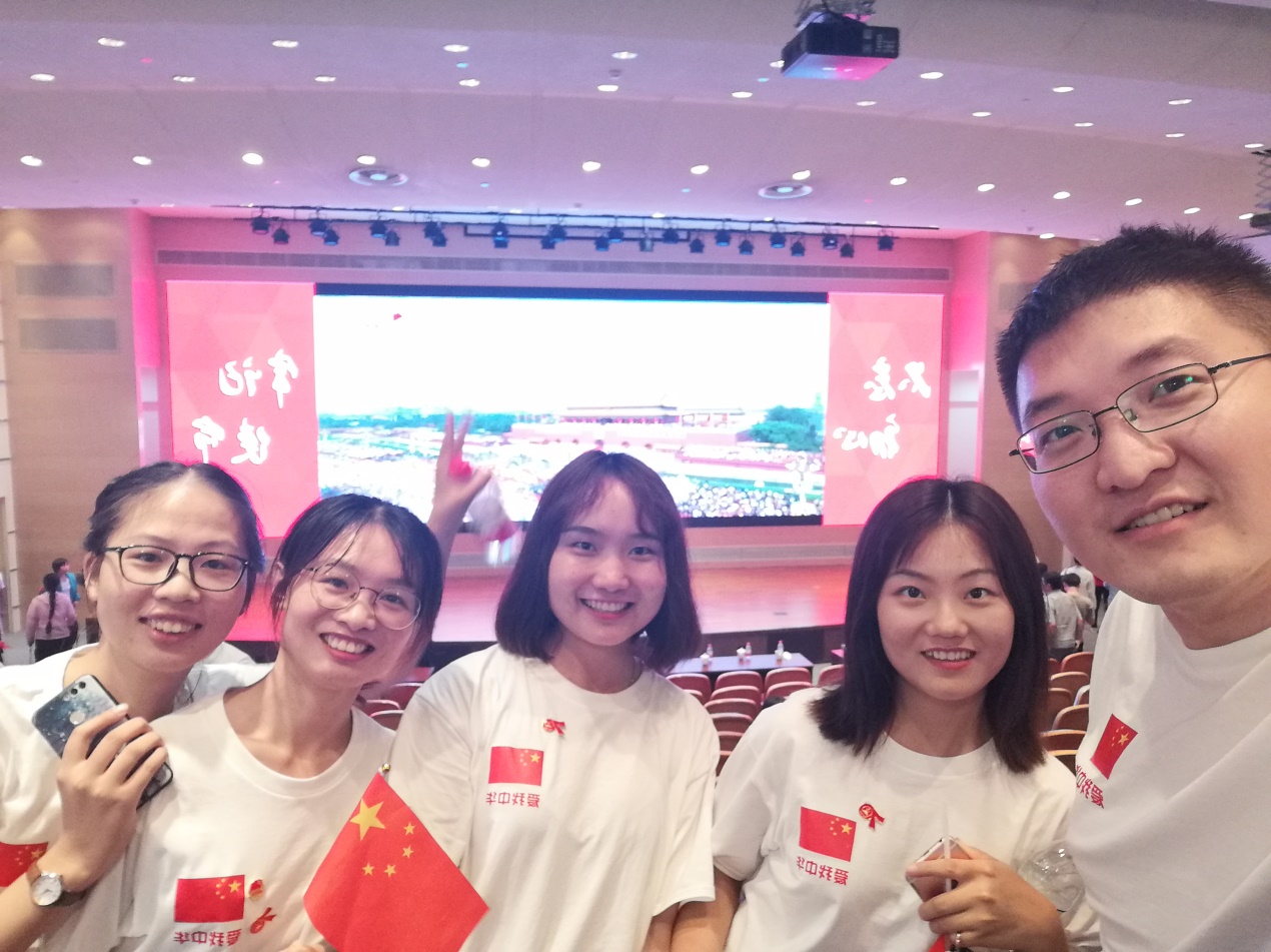 穿着印有国旗和“爱我中华”字样的T恤,戴上团徽和“建国七十周年”纪念徽章,站在灯火通明的体育馆内,内心的激动与期待早已无法掩盖,化为了一张张诚挚的笑脸。