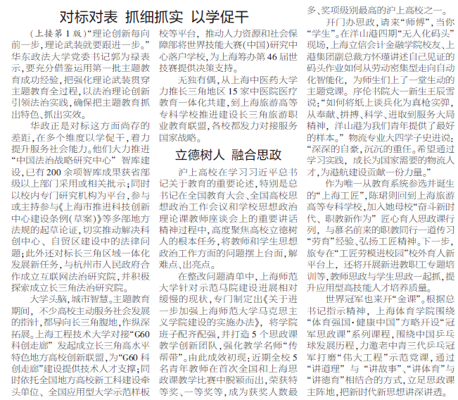 沪上正参加第二批主题教育的众多高校,都像上师大一样在主题教育办“挂图作战”,扎实推进整改落实。从特色学习、以学促干到融合思政,参加第二批主题教育的49所市属高校正对标对表、抓细抓实。