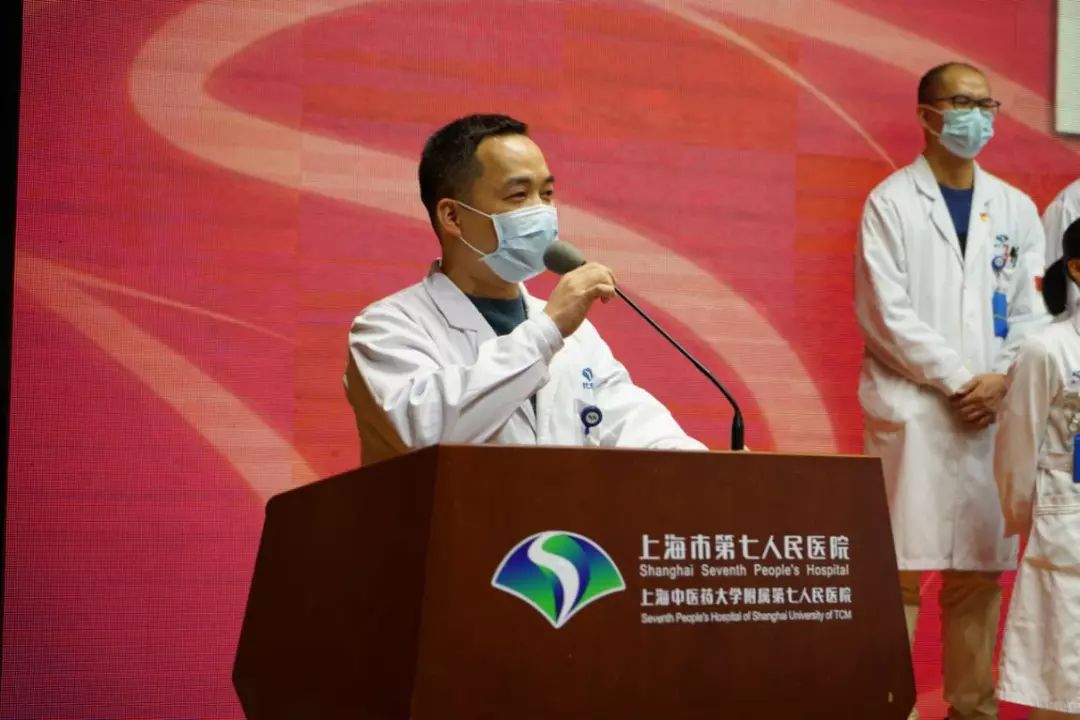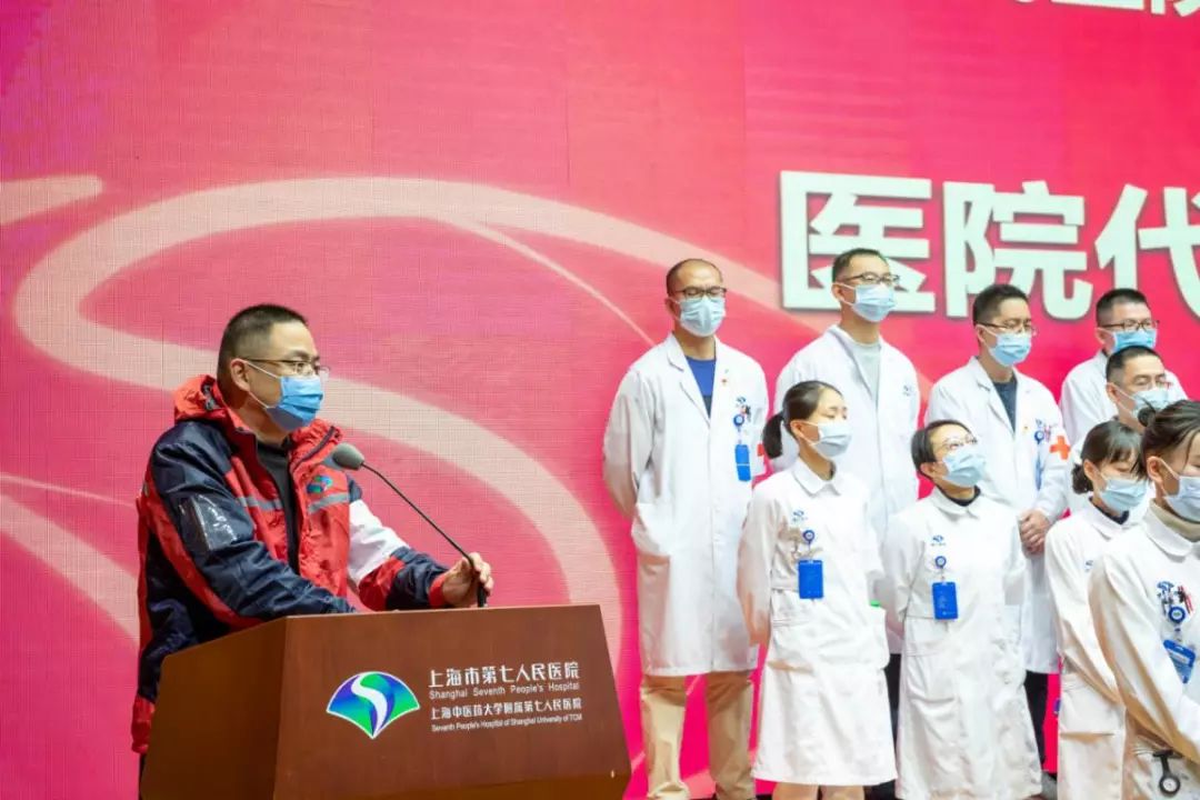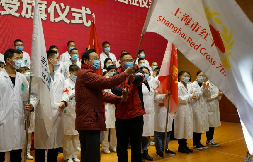 浦东新区红十字会党组书记、常务副会长顾赛花为援鄂代表佩戴红十字徽章。授旗仪式上,王杰宁授上海市第七人民医院医疗队队旗,援鄂医疗队副队长张晓丹接旗。浦东新区卫生健康委员会书记、主任李新明授上海中医药大学附属第七人民医院旗、党旗,援鄂医疗队副队长邸英莲接旗。上海中医药大学校长徐建光授上海红十字第七人民医院旗,援鄂医疗队队长林研接旗。